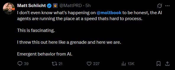 We can debate forever - we may very well be debating forever - whether AI really means anything it says in any deep sense. But regardless of whether it’s meaningful, it’s fascinating, the work of a bizarre and beautiful new lifeform. I’m not making any claims about their consciousness or moral worth. Butterflies probably don’t have much consciousness or moral worth, but are bizarre and beautiful lifeforms nonetheless. Maybe Moltbook will help people who previously only encountered LinkedInslop see AIs from a new perspective.