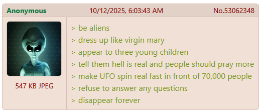 I take this one sort of seriously, but I also think it violates a general heuristic against conspiracies and false flag attacks. If some incredibly powerful being is telling you that it’s the Virgin Mary, and discussing Catholic doctrine, and performing healing miracles, I think you should at least start with a presumption of taking it seriously. But at this level of distance from any well-established priors, who even knows?