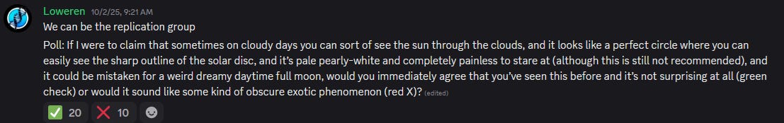 But for those of us who grew up in the 1980s, who were “rationalists” when rationalism hadn’t been invented and we had to call ourselves “skeptics”, UFOs were as important a subject of rationalist/skeptical inquiry as is AI risk today (and for about the same reason). People learned an awful lot in those days. One of those things is that most people don’t spend much time really looking at the sky and will consistently fail to recognize even slightly-unusual phenomena, like the sun partially veiled by clouds. And the other, more important thing is that when presented with an image they don’t recognize, people will very predictably see what their culture has taught them to expect to see.