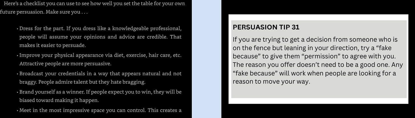 I haven’t watched his videos, but they have names like You Could Be MUCH More Persuasive, The Persuasion Playbook (“Learn practical techniques to harness the power of persuasion”), and Persuasion Techniques That Will Improve Your Business And Life.
