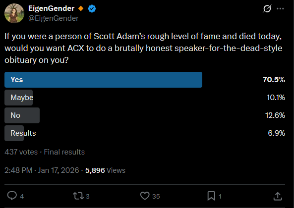 Without having a general solution to this problem. In this situation, I mainly considered the point above - I don’t think this was a fully hostile article, and so I didn’t run my full “is it appropriate to write a hostile article about this person?” check. But secondarily, I think Adams linked my blog post as part of the usual blogosphere activity of recommending interesting links, not as a specific attempt to kindle a friendship with mutual obligations. If I were his friend, then I hope I would understand him well enough to know whether he would want a mixed memorial like this (and if not, I wouldn’t do it).