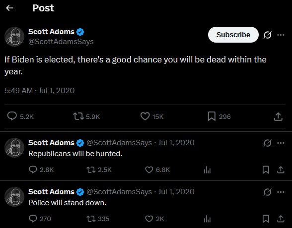 I have seen other people try to link this to examples of Republicans actually getting killed, such as Charlie Kirk. But Adams was telling his readers there was “a good chance” that “they” would be dead within a year, which I think implies this fate happening to a significant proportion of ordinary Republicans, not just one prominent person. Also, Kirk was five years after the comment was posted.