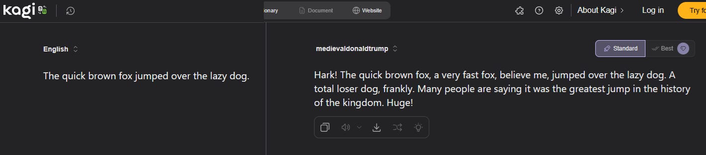 If you hand-change the URL, you can do whatever you want. For example, if you take the link https://translate.kagi.com/?from=en&to=linkedin&text=The+quick+brown+fox+jumped+over+the+lazy+dog and replace the term linkedin with medievaldonaldtrump, you get: