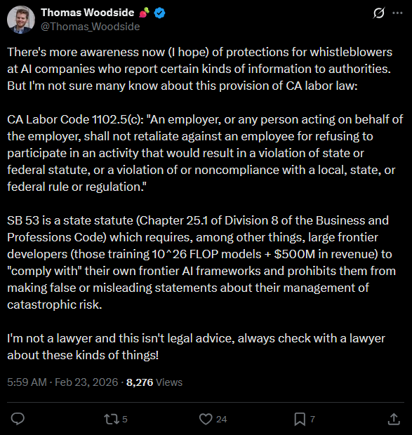 20: California’s AI safety law may incidentally create whistleblower protections for AI company employees in California (h/t @Thomas_Woodside):