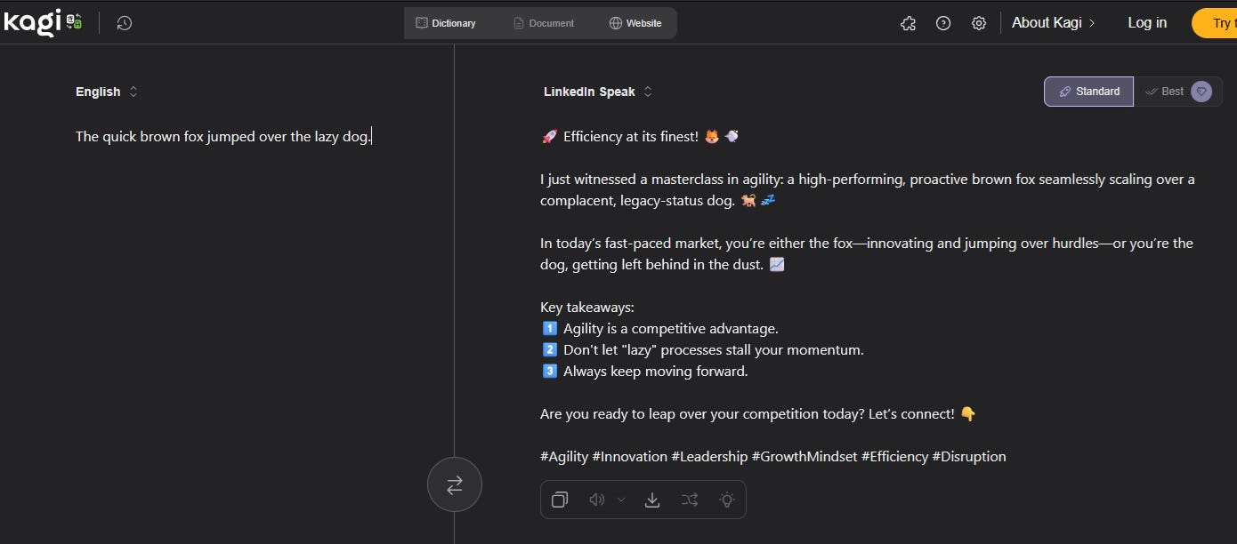 7: Related: Kagi Translate lets you translate from any language/style/way-of-speaking to any other. For example, here’s English → LinkedIn