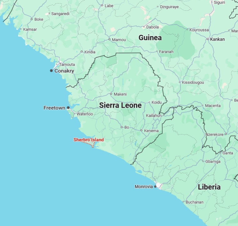Sherbro, Sierra Leone. A place synonymous in the popular imagination with the phrase “Sherbro, Sierra Leone”. Population 30,000. Size 230 square miles (or “just a little bit smaller than Singapore”, according to its boosters).
