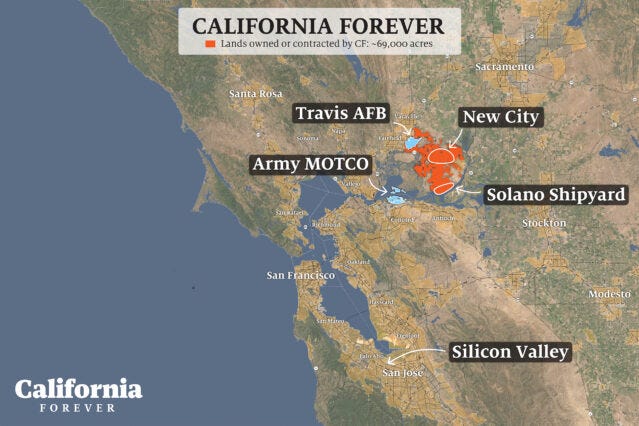 In 2023, a stealth mode company announced it had quietly bought up a city-sized tract of land in Solano County, and would be placing an initiative on the county ballot to let them build a futuristic planned community there. Enough local NIMBYs protested that the company and county jointly withdrew the initiative in favor of seeking some other agreement. In 2025, they announced their new strategy: they would partner with nearby Suisun City. Suisun would annex their land and permit development there, avoiding a county-wide referendum (they might also make a deal with another nearby city, Rio Vista).