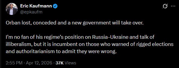 As for Trump, I spent his whole first term low-key rolling my eyes at people saying he wanted to destroy democracy. Then we got the 2020 election, the Georgia racketeering case, and January 6, and I sent in my Apology Form. Obviously Trump tries to overturn elections he doesn’t like! The question is no longer whether he tries this. It’s how hard he pushes, what methods he is and isn’t willing to use, and whether the system is weak enough for him to succeed. Give the “democratic backsliding experts” a well-deserved W, and thank God that our system proved strong enough to resist. Then add an extra thanks that Hungary can say the same.