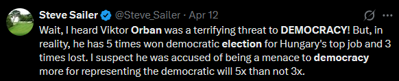 The problem is, the latest round of Orban commentary doesn’t limit itself to saying he wasn’t a dictator. It goes further and says that even phrasing-agnostic worries about him being undemocratic have been debunked! For example, from Mike Pesca2: