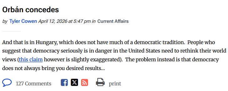 Here, Pesca treats even calling Hungary a “fragile democracy” as cause for concern! And let’s look at Cowen again: