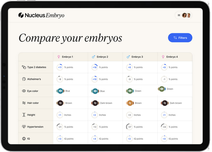 Last month, a startup called Nucleus took the plunge. They had previously offered 23andMe style genetic tests for adults. Now they announced a partnership with Genomic Prediction focusing on embryos. Although GP would continue to only test for health outcomes, you could forward the raw data from GP to Nucleus, and Nucleus would predict extra traits, including height, BMI, eye color, hair color, ADHD, IQ, and even handedness.