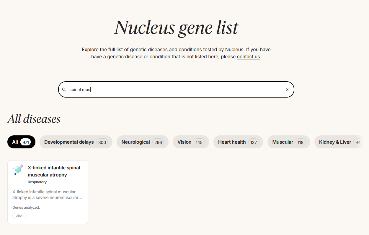 …they don’t screen for SMN, which causes 95% of spinal muscular atrophy cases. They only screen for UBA1, which causes a distinct and much rarer condition called x-linked infantile spinal muscular atrophy. Professional organizations publish guidelines for what genes need to be screened in a screening product, and Nucleus does not appear to be following them.