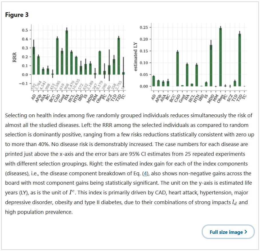 …and the section of the post called “Antagonistic Pleiotropy” for more. However, this paradoxical benefit is only true for a few conditions like diabetes - for everything else, selecting on health index does better than you would naively think, but still does not decrease the risk of a given condition as much as selecting against that condition directly.