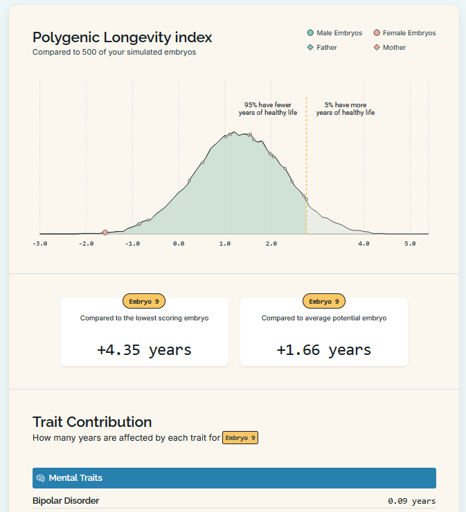 For Herasight, it’s a “polygenic longevity index”. They don’t give exact risk reduction numbers for each disease, saying that it depends too much on a couple’s specific family history, but say that most people gain 1-4 years of healthy life (when I test it on a set of twenty embryos, the the healthiest gets an extra 1.66 years).