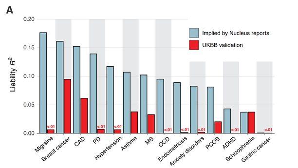 They say Nucleus has inflated the accuracy of their scores. This is most dramatic for a few conditions like ADHD, where the leading published polygenic score is based on 2,300,000 variants but explains only ~1% of variance in the condition. Nucleus’ score is based on 12 variants13 and (implicitly) claims to explain 3-6%. This doesn’t make sense.