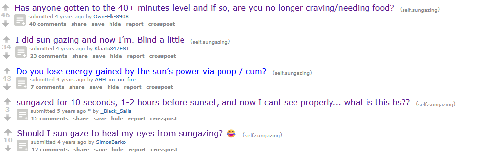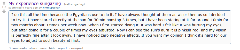 There are guides to sungazing safely; the most important rule seems to be to only gaze around sunrise/sunset, and only for a very short period of time. I don’t know whether these rules actually make sungazing safe - the posts above suggest no - but it doesn’t matter; many users proudly ignore them. Sungazing Redditors often say they do their sungazing at high noon, or for extreme durations: