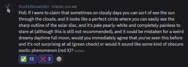 But if you’ve seen a sun miracle already, please fill out this form. I’m looking for people who have visited Marian shrines, people who have sungazed, and people who just happen to have seen something odd about the sun in their daily lives. I know this has selection bias, but I want to get some preliminary qualitative data first. I’ll do something more formal on the next ACX survey, but that won’t happen for a while. And if you have something to share that isn’t a good match for the form, mention it in the comments.