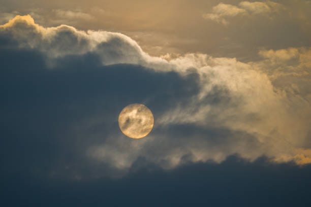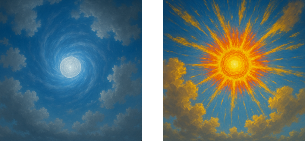 The sun was not opaque, veiled or diffused. It gave light and heat and was brightly outlined by a beveled rim. The sky was banked with light clouds, patched with blue here and there. Sometimes the sun stood out alone in rifts of clear sky. The clouds scuttled along from west to east without dimming the sun. They gave the impression of passing behind it, while the white puffs gliding sometimes in front of the sun seemed to take on the color of rose or a delicate blue.