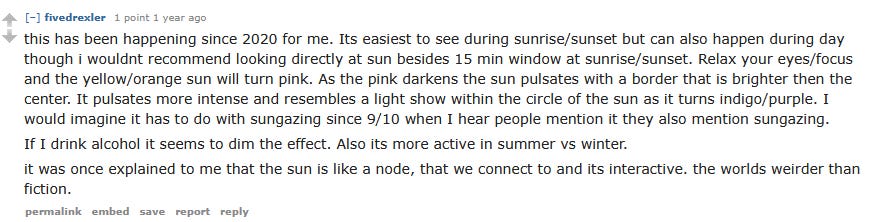 Have any of these Buddhas-of-our-age noticed unusual phenomena similar to those reported at Fatima? Here are some selections from r/sungazing and some associated subreddits: