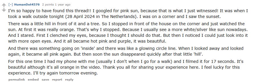 Most of these come from one topic in the forum, Sun Turned Purple? There are hundreds of other topics about optimal sungazing times, lists of benefits, and (of course) various people who got severe eye damage, and none of these people ever mentioned the color-changing swirling sun until this one topic, where one person says “has anyone else ever seen this?” and dozens of people agree that they have. Does that mean that lots of people might have seen it, and it’s just too weird to talk about?