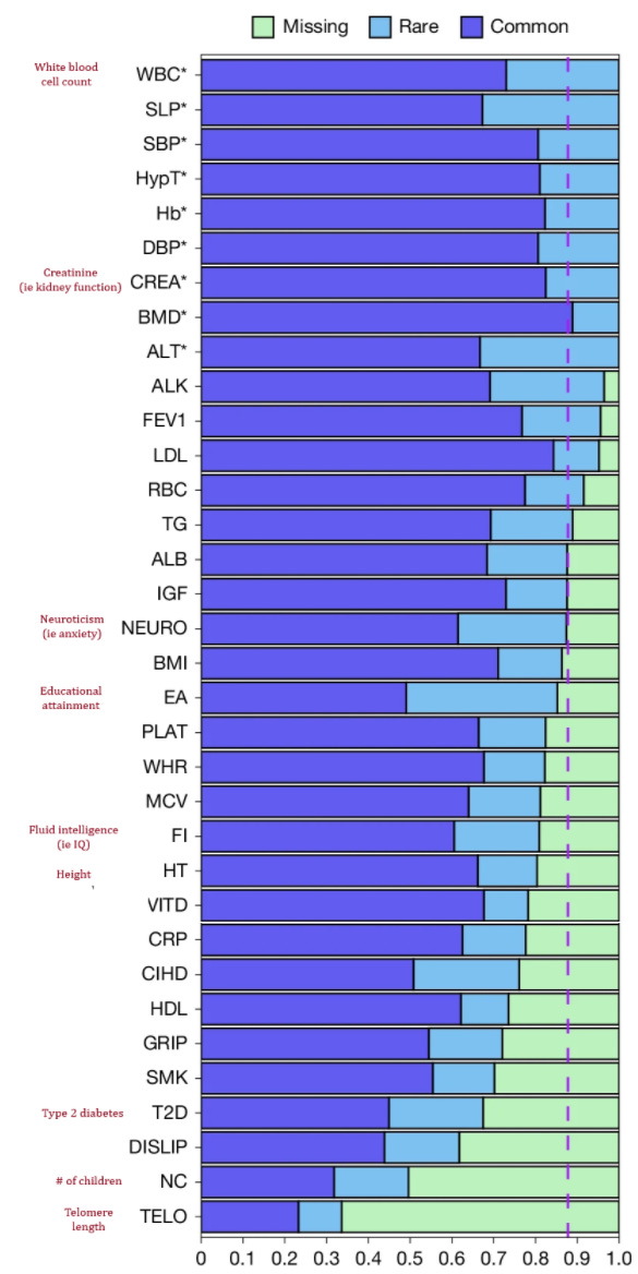 That is, once you include the rare variants, the amount of genetic variation that “should” exist but doesn’t shrinks to only 12%. Plausibly an even bigger study, investigating even rarer variants, could shrink the gap further, all the way to zero. The oldest and strongest argument against hereditarianism - if all these genes exist, why can’t we find them? - has finally been put to rest. You couldn’t find them because they were rare. But when you include rare variants in your search, you can find at least 88% of them.