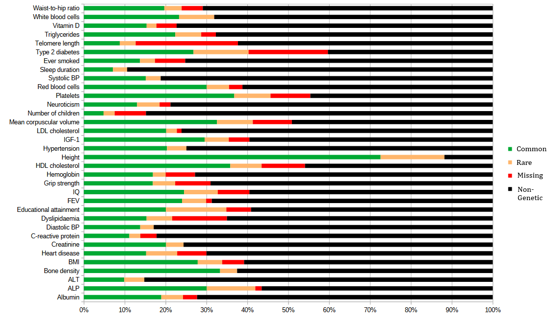The latter seemed plausible because typical genetic studies only investigate the genes that most commonly vary across people - about 0.1% of the genome. Maybe the other 99.9% of genes, even though they rarely vary across people, are so numerous that even their tiny individual effects could add up to a large overall influence. There was no way to be sure, because variation in these genes was too rare to study effectively.