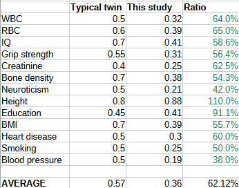 But this same argument can be deployed against the nurturists’ favorite explanations for high twin study numbers: population stratification and assortative mating. These could be expected to affect socially-relevant and environmentally-mediated traits like educational attainment. But nobody assortative-mates on white blood cell count, and these types of “hard” biomedical traits are just as depressed in this study as the “soft” behavioral ones.