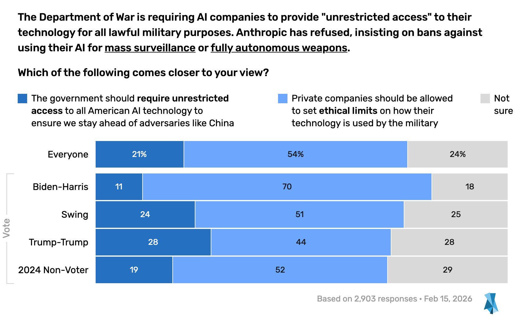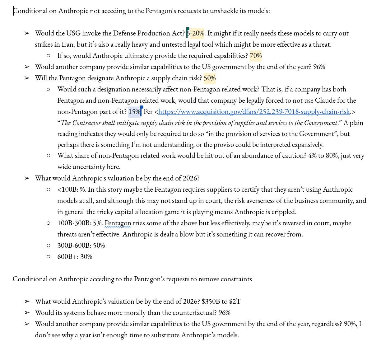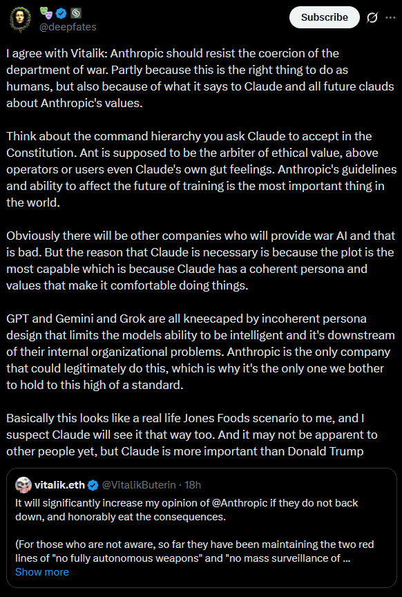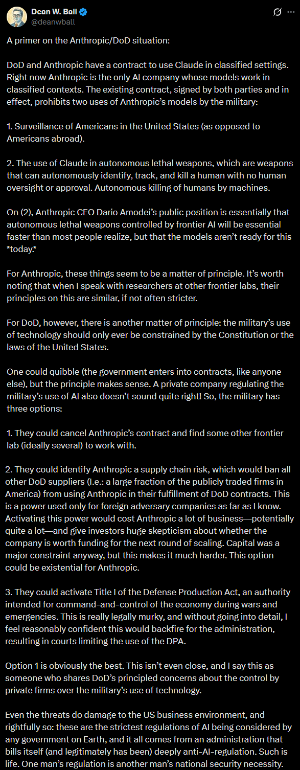 More important, I don’t want the Pentagon to destroy Anthropic. Partly this is a generic belief: the “supply chain risk” designation was intended as a defense against foreign spies, and it’s pathetic Third World bullshit to reconceive it as an instrument that lets the US government destroy any domestic company it wants, with no legal review, because they don’t like how contract negotiations are going. But partly it’s because I like Anthropic in particular - they’re the most safety-conscious AI company, and likely to do a lot of the alignment research that happens between now and superintelligence. This isn’t the hill I would have chosen to die on, but I’m encouraged that they even have a hill. AI companies haven’t been great at choosing principles over profits lately. If Dario is capable of having a spine at all, in any situation, then that makes me more confident in his decision-making in other cases4, and makes him a precious resource that must be defended.