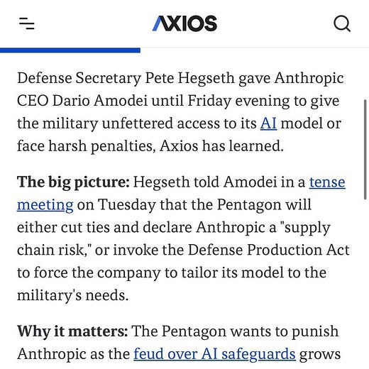 Supposedly the Pentagon already has Grok integrated with classified systems, but it’s not good and they want a more cutting-edge model, which means either Claude, GPT, or Gemini.