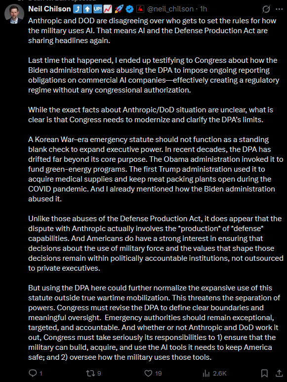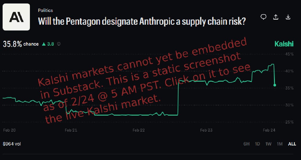 Isn’t Hesgeth just doing his job of trying to ensure the military has the best weapons possible? The idea of declaring a US company to be a foreign adversary, potentially destroying it, just because it’s not allowing the Pentagon to unilaterally renegotiate its contract is not normal practice. It’s insane Third World bullshit that nobody would have considered within the Overton Window a week ago. It will rightly chill investment in the US, make future companies scared to contract with the Pentagon (lest the Pentagon unilaterally renegotiate their contracts too), and give the Trump administration a no-legal-review-necessary way to destroy any American company that they dislike for any reason. Probably the mere fact that a government official has considered this option is reason to take the “supply chain risk” law off the books, no matter how useful it is in dealing with Huawei etc, since the government has proven it can’t use it responsibly. Every American company ought to be screaming bloody murder about this. If they aren’t, it’s because they’re too scared they’ll be next.