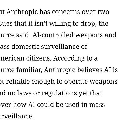 More specifically, Anthropic and Dario have lately been publishing some work saying they’re less-than-maximally concerned about AI scheming and power-seeking and are going to focus their safety efforts on smaller risks like AIs with coincidentally bad personalities, humans misusing AIs, etc. This could either be their honest opinion, or an excuse to jettison annoying safety work in favor of the bottom line. This standoff suggests they are very genuinely concerned about humans misusing AI and willing to stand against it even when it threatens their bottom line, which means it’s their honest opinion, which means that maybe when there’s more evidence for AI power-seeking they’ll come around and start honestly worrying about that too.