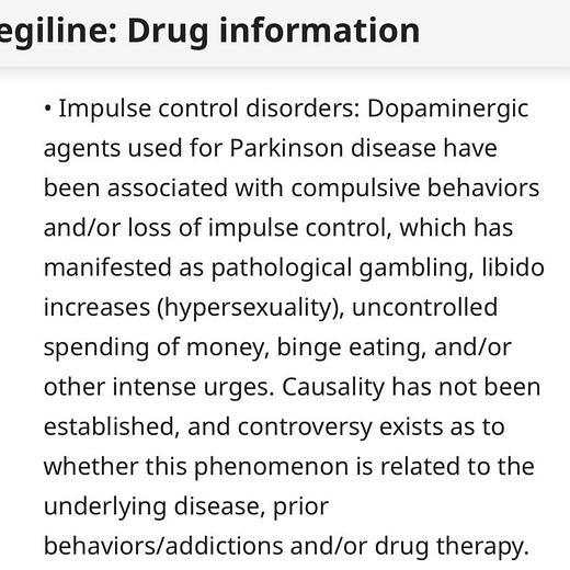 I can see why this caught so much attention. But let me rain on the parade: this seems pretty rare. Grossett et al found a prevalence of about 8% on any antiparkinsonian, but none of the 17 patients they found were taking selegiline. Lanteri et al quote a prevalence of 2.2 - 7%, but only one of the 15 patients they found was on selegiline, and that person was also on other medications more likely to cause the condition. This doesn’t prove that selegiline never causes problem gambling - but it suggests it’s one of the less likely medications to do so, probably at somewhere well below 2 - 8% of patients.