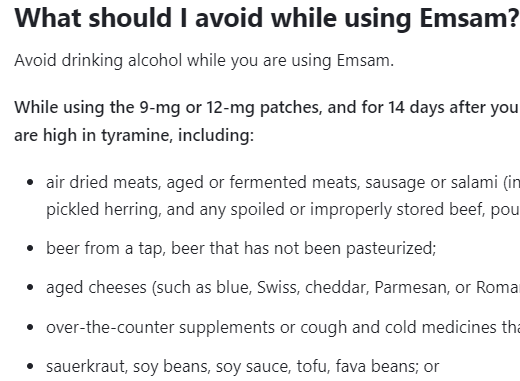 Selegiline is an even less magical bullet than usual. People call it an antidepressant, anti-Parkinsonian, and stimulant, and all of those descriptions are accurate. It also does one unrelated thing: it disables a key digestive enzyme that prevents certain foods from killing you. For boring technical reasons, some pharma companies thought this might not happen if you delivered selegiline through a patch on the skin. For other boring technical reasons, the FDA disagreed and said people on the selegiline patch still shouldn’t eat those foods. The pharma companies decided to release the patch anyway, in case some people liked patches better than pills - and so Emsam was born.