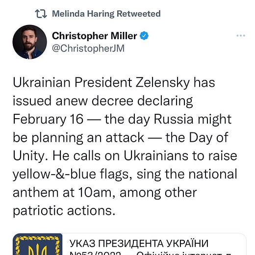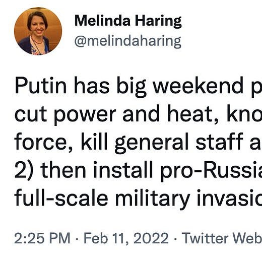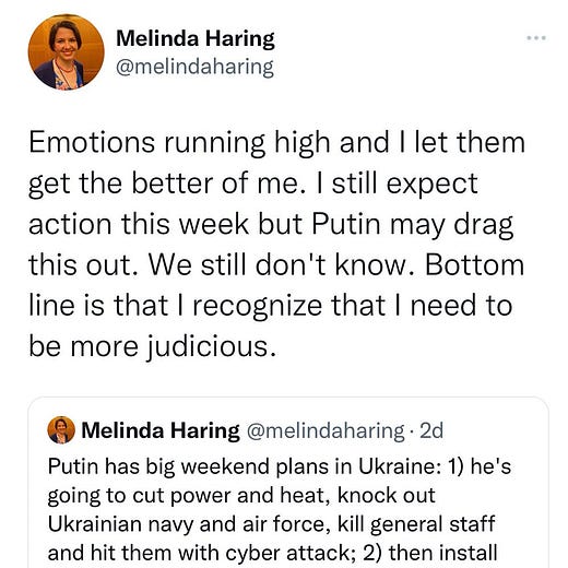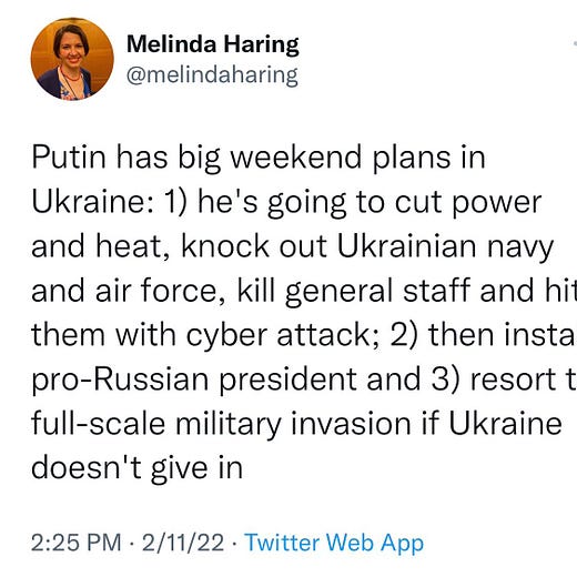 I did try to qualify much of what I said on this topic to allow for the possibility that an invasion could in fact take place. In a February 10 article here on Substack, I wrote that a Russian escalation was “ominously plausible.” And I still think the formulation in this tweet from January 23 is very much legitimate: