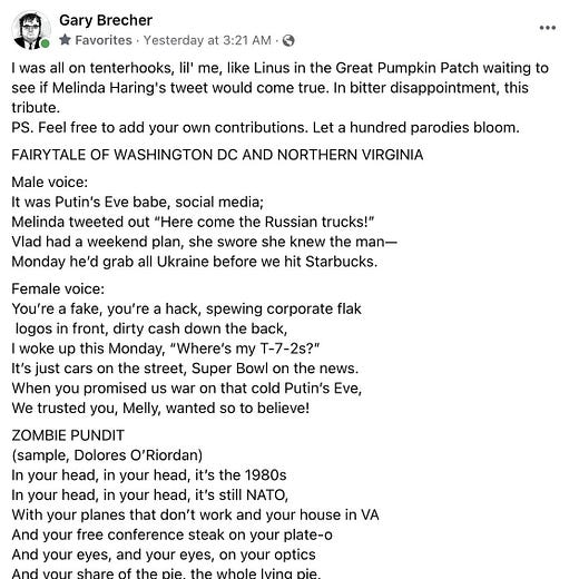 I’ll need to reflect more on the implications of this outcome. All I can promise you is transparency, honesty, and a willingness to correct for any blindspots. One potential blindspot here was placing too much emphasis on the repeated and vehement criticism by actual Ukrainian officials of what they decried as alarmist US rhetoric. Just last week, I interviewed a sitting member of the Ukraine parliament who straight-up told me that externally-generated “panic” was a far greater threat to Ukraine’s security than any forthcoming Russian invasion. Ukraine’s president, over and over again, was even more searing in his own repudiations of US government and media behavior. I don’t have a great explanation for this dynamic yet, but it’s possible what they were telling me tracked too closely with my pre-existing disdain for official US claims vis-a-vis Russia — which in the very recent past have been wildly wrong and destructive. As you’ll remember if you lived through Russiagate.