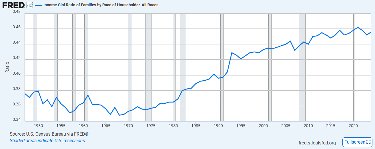 Although US income inequality is high and the secular trend is upward, the past decade or so, when vibecession complaints have been at their worst, has seen a relative plateau: