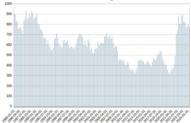 Does this fully solve the vibecession problem? I don’t think so. For one thing, if we take the Trump and Sanders argument seriously, the bad vibes had already started in the late 2010s, when real mortgage prices were the lowest in decades. And even today, mortgages are no worse than in the 1980s, during the high interest rates of the Volcker Shock.