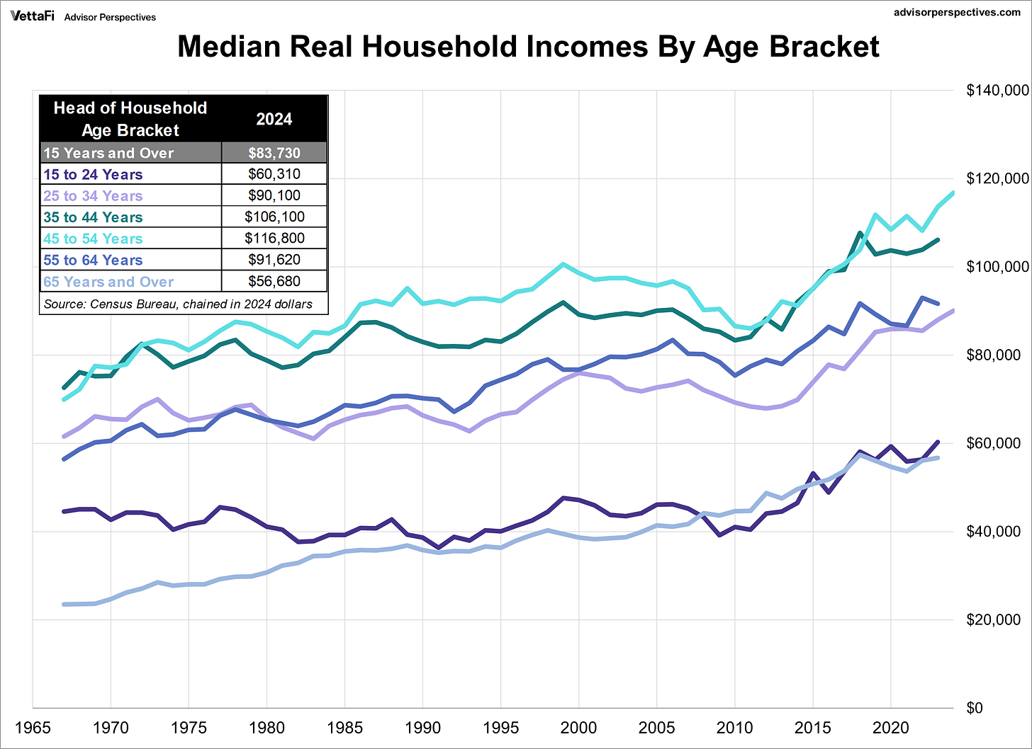 Just as our previous graphs imply, Millennials and Zoomers earn significantly more than Boomers did at the same age, even in inflation-adjusted dollars.