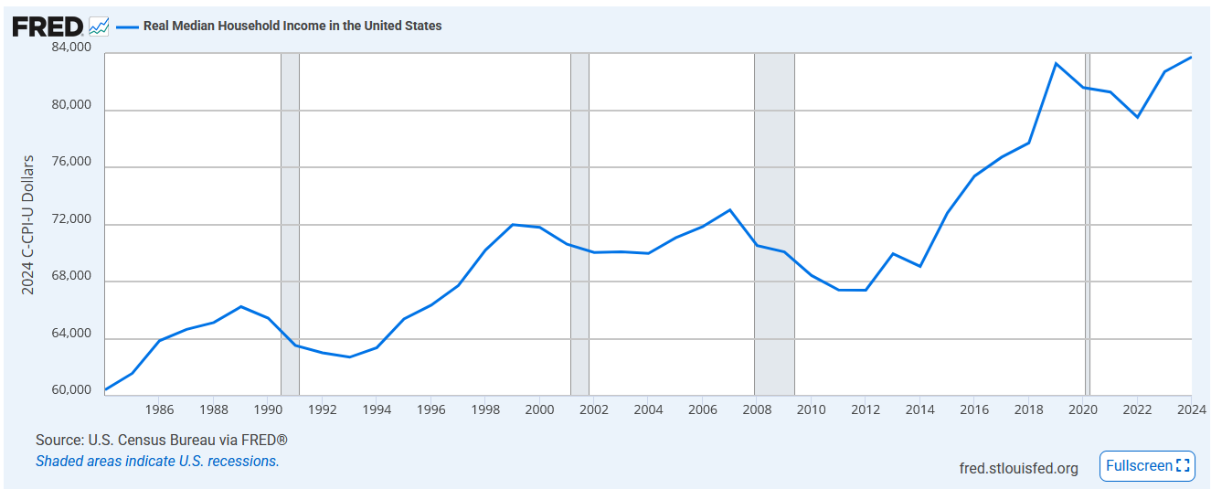 Here’s real median household income in the US over time (source):