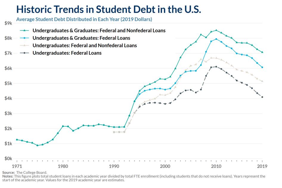 It seems to have been declining since about 2010! Why? The government’s biggest student loan program is capped at $31,000, most people started hitting that max around 2010, the government never changed the cap, and the value of $31,000 goes down with inflation every year.
