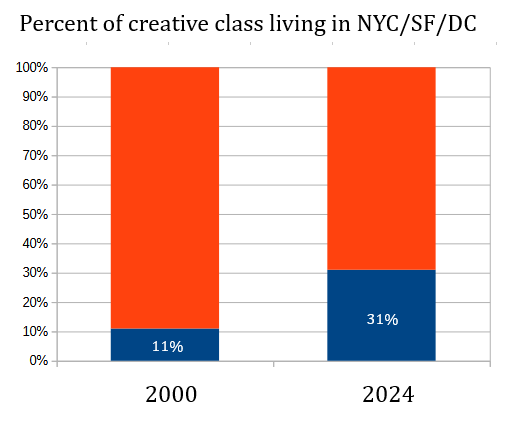 Does this disprove the Brooklyn Theory of Everything? Not necessarily. The new revised version says that the concentration of young elites and would-be elites in NYC and SF is itself a new phenomenon.
