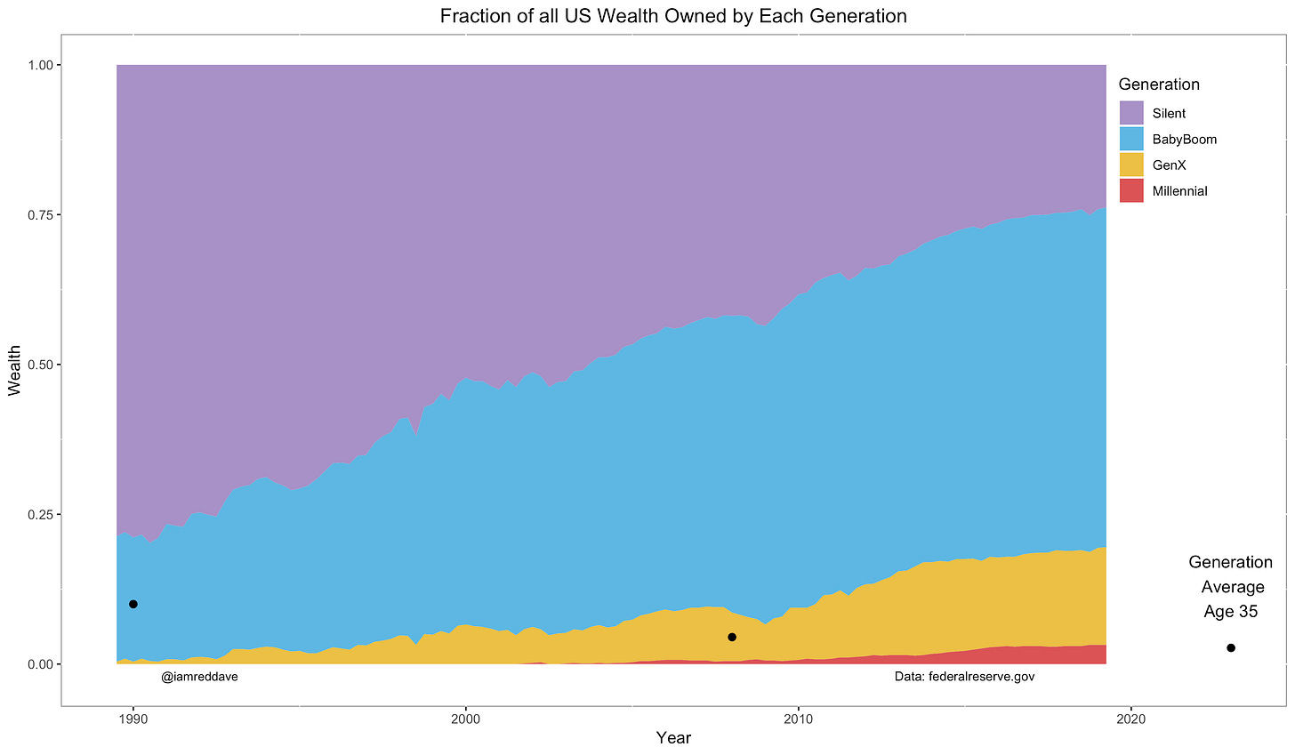 But on a cohort level (how many resources each generation controls as a group), it is happening. Thirty years ago, people under 35 held about 11% of total wealth. Today, they hold about 4%. (source):