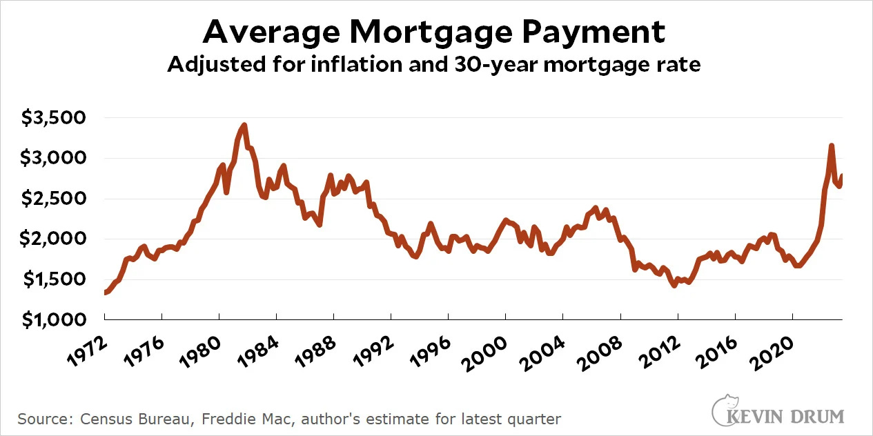 This matches Drum’s data enough to build confidence, and it shows that the post-pandemic spike has lasted. Mortgage payments are almost twice as high as in the 2010s.