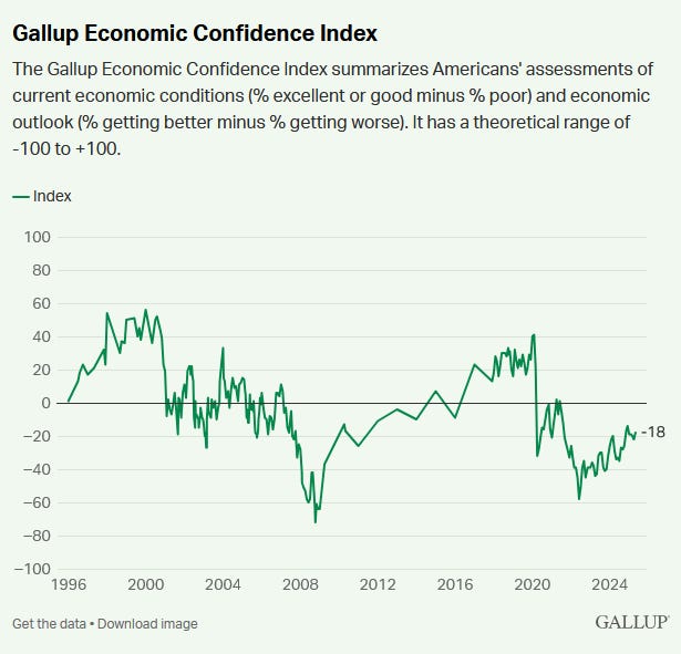 The term “vibecession” most strictly refers to a period 2023 - 2024 when economic indicators were up, but consumer sentiment (“vibes”) was down. But on a broader level, the whole past decade has been a vibecession.