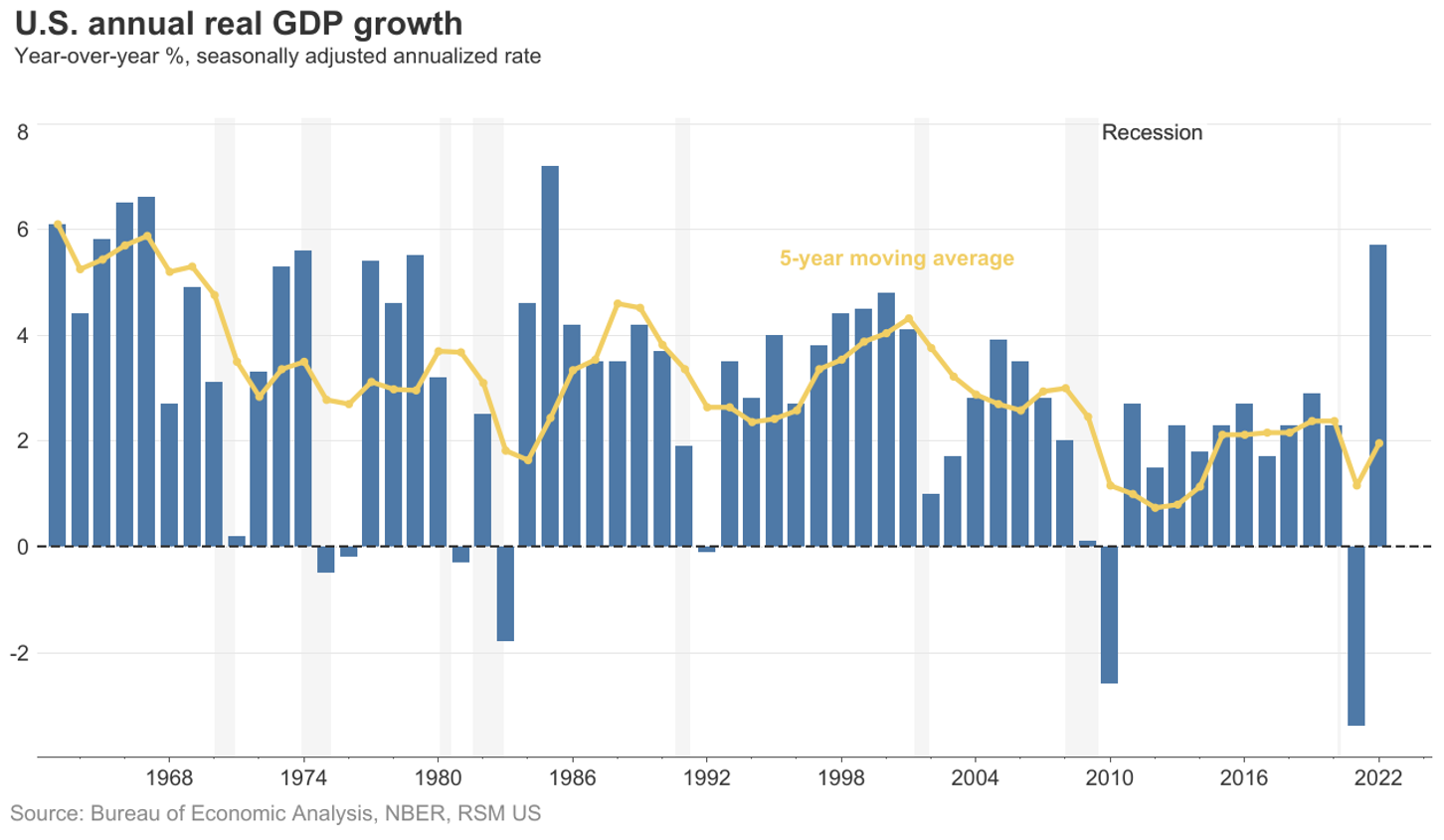 The rate of GDP growth has decreased over the past several decades. Although GDP growth is still positive, if you were expecting the high GDP growth of the past, the current level of low GDP growth might seem lower than expected, which could be confused with negative growth and things getting worse.