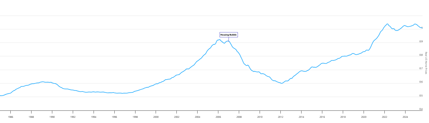 Here is the Case-Shiller index, the standard measure of US home prices. I’ve started it in 1985 to match our other graphs: