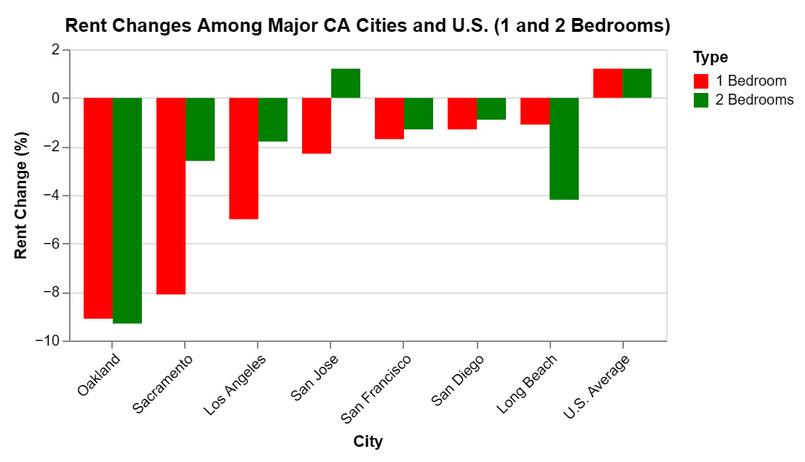 Second, rents fell in most big California cities. Although unsheltered homeless usually can’t afford apartments at any rent, low rents still make it easier for friends and family members to house them.