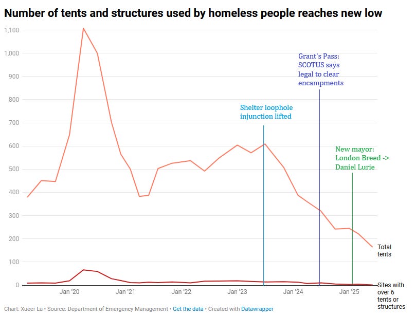 After a big spike during the worst part of COVID, tents plateaued until mid-2023, then steadily declined. This timeline doesn’t match the two factors most people credit with the decline - the Grant’s Pass v. Johnson case where the Supreme Court made it easier to clear encampments, and Daniel Lurie taking over as mayor.