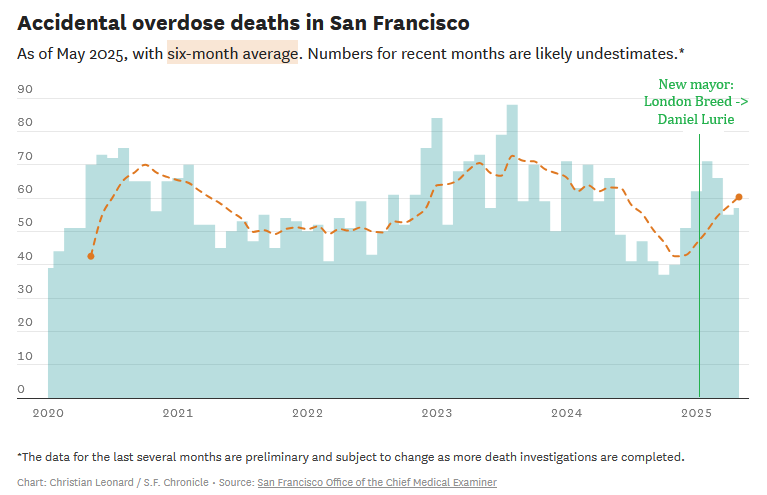 Mayor Lurie’s other big homelessness-related policy was getting tough on fentanyl - clearing up the open-air markets, cutting “harm reduction” programs that give free drug paraphernalia to users. To his credit, there are many fewer open-air drug markets now. As for drug-related deaths:
