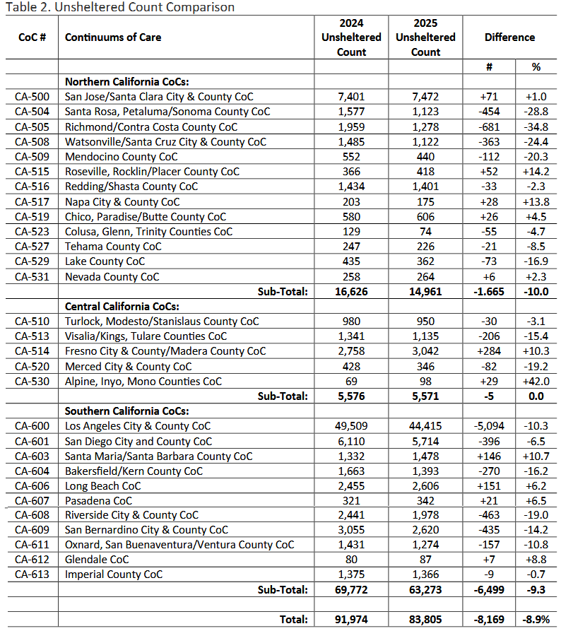 We don’t have this year’s numbers from San Francisco. But assuming it followed the state trend of -9%, this is probably too low for anyone to notice. If you’ve personally felt like there are fewer homeless people around, it’s probably because of the encampment cleanups and the subsequent tendency for them to lie low.